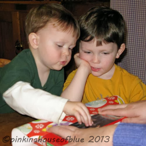Since the gift is from them, I thought that it was only appropriate that they wrap it too. Neither of them have ever wrapped a gift before, and I suppose you could say that they still haven't on their own. Mommy helped quite a bit, and one of the Care Bears has about 15 strips of tape on its nose, (which is nowhere near any of the places we needed tape) but they had fun. That's the most important part, right?